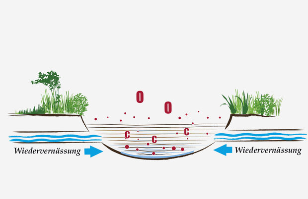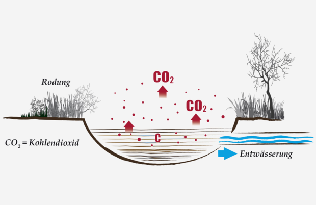Canals were built to facilitate logging and the transport of tree trunks. These drain the peat body, the soil dries out, the peat reacts with oxygen and releases the climate-damaging CO₂ in large quantities.