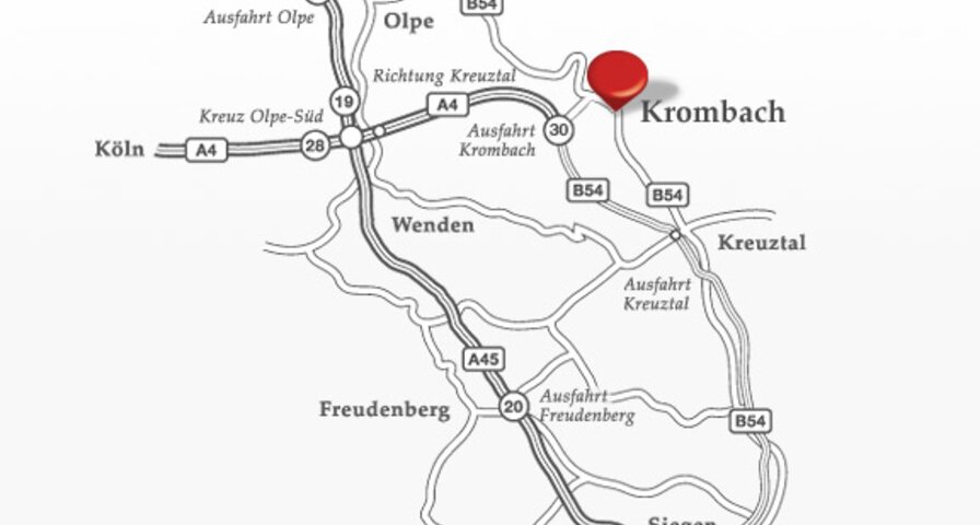 Tome la A4 en dirección a Olpe/Siegen-Nord/Kreuztal hasta la salida de Krombach (30) y tras 3 km gire a la derecha y continúe por la B54 en dirección a Kreuztal hasta Krombach.